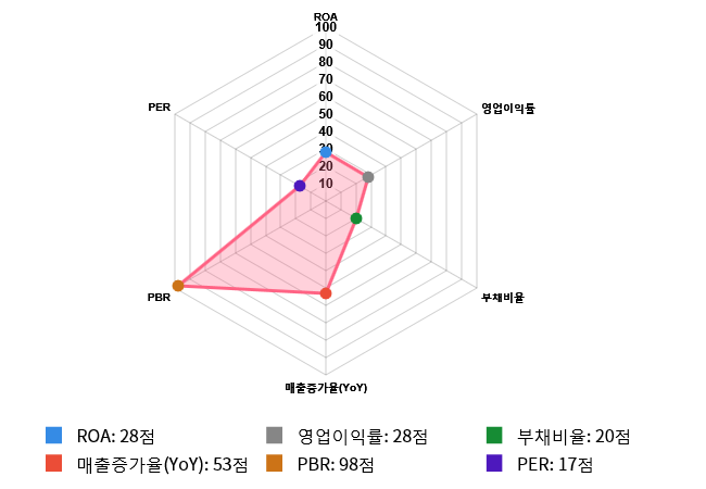 그리고 성장성(매출증가율(YoY)) 역시 도드라지는 편이다. 성장성 점수는 53점으로 두번째로 높은 점수를 기록했다. 매출증가율(YoY)은 전체 시장 내 856위를 기록하며 상위 46.62%에 위치했다. 업종별로는 9위를 기록하며 상위 42.11%에 위치했다.