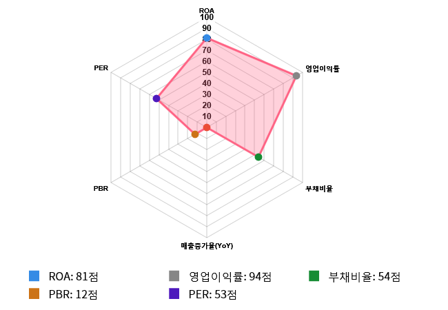 그리고 효율성(ROA) 역시 도드라지는 편이다. 효율성 점수는 81점으로 두번째로 높은 점수를 기록했다. ROA는 전체 시장 내 338위를 기록하며 상위 18.56%에 위치했다. 업종별로는 37위를 기록하며 상위 16.67%에 위치했다.