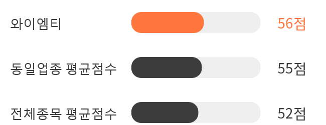 AI 인공지능 분석을 통한 와이엠티의 종목 종합 스코어는 56점을 기록했다.