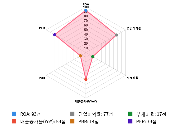 (위의 AI인공지능 점수는 재무 데이터를 기반으로 전체 상장 종목과 비교/분석하여 도출한 점수로 높은 점수가 반드시 높은 수익률을 보장하지 않습니다. 위의 자료는 당사의 추천 종목이 아니며, 투자 시 참고용으로 제시해드리는 것입니다.)