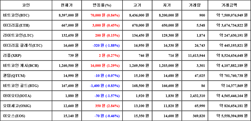 현재 암호화폐 거래소 "코인원"에 따르면 가상화폐 대장 격인 비트코인의 시세는 24시간 전 대비 70,000원(0.84%) 상승한 8,397,000원에 거래되고 있다.