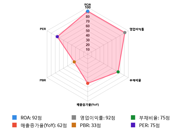 그리고 수익성(영업이익률) 역시 도드라지는 편이다. 수익성 점수는 92점으로 또한 가장 높은 점수를 기록했다. 영업이익률은 전체 시장 내 167위를 기록하며 상위 8.42%에 위치했다. 업종별로는 27위를 기록하며 상위 12.56%에 위치했다.