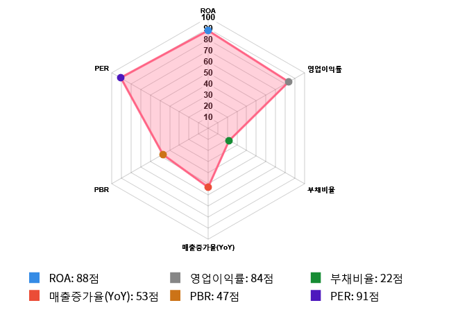 그리고 효율성(ROA) 역시 도드라지는 편이다. 효율성 점수는 88점으로 두번째로 높은 점수를 기록했다. ROA는 전체 시장 내 239위를 기록하며 상위 12.18%에 위치했다. 업종별로는 37위를 기록하며 상위 9.05%에 위치했다.