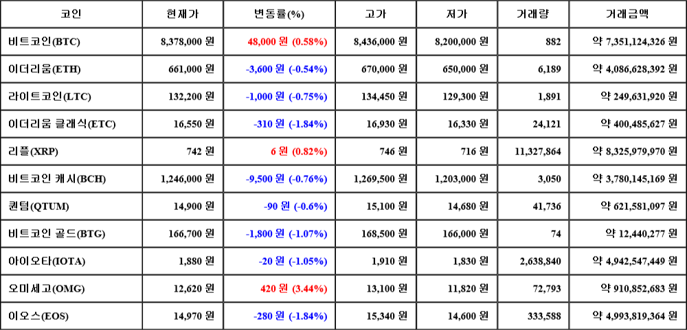 현재 암호화폐 거래소 "코인원"에 따르면 가상화폐 대장 격인 비트코인의 시세는 24시간 전 대비 48,000원(0.58%) 상승한 8,378,000원에 거래되고 있다.