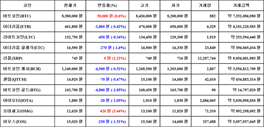 현재 암호화폐 거래소 "코인원"에 따르면 가상화폐 대장 격인 비트코인의 시세는 24시간 전 대비 50,000원(0.6%) 상승한 8,380,000원에 거래되고 있다.