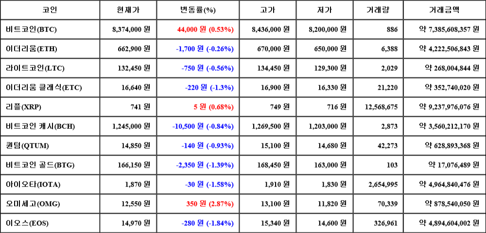 현재 암호화폐 거래소 "코인원"에 따르면 가상화폐 대장 격인 비트코인의 시세는 24시간 전 대비 44,000원(0.53%) 상승한 8,374,000원에 거래되고 있다.