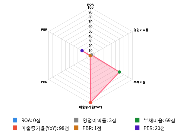 그리고 안정성(부채비율) 역시 도드라지는 편이다. 안정성 점수는 69점으로 두번째로 높은 점수를 기록했다. 부채비율은 전체 시장 내 629위를 기록하며 상위 30.71%에 위치했다. 업종별로는 214위를 기록하며 상위 35.88%에 위치했다.