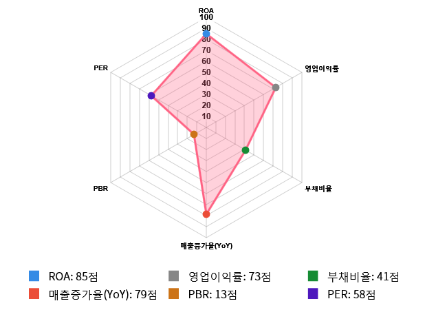 그리고 성장성(매출증가율(YoY)) 역시 도드라지는 편이다. 성장성 점수는 79점으로 두번째로 높은 점수를 기록했다. 매출증가율(YoY)은 전체 시장 내 379위를 기록하며 상위 20.58%에 위치했다. 업종별로는 166위를 기록하며 상위 30.9%에 위치했다.