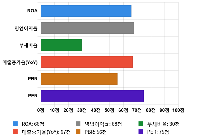 그리고 수익성(영업이익률) 역시 도드라지는 편이다. 수익성 점수는 68점으로 두번째로 높은 점수를 기록했다. 영업이익률은 전체 시장 내 630위를 기록하며 상위 31.86%에 위치했다. 업종별로는 66위를 기록하며 상위 28.89%에 위치했다.