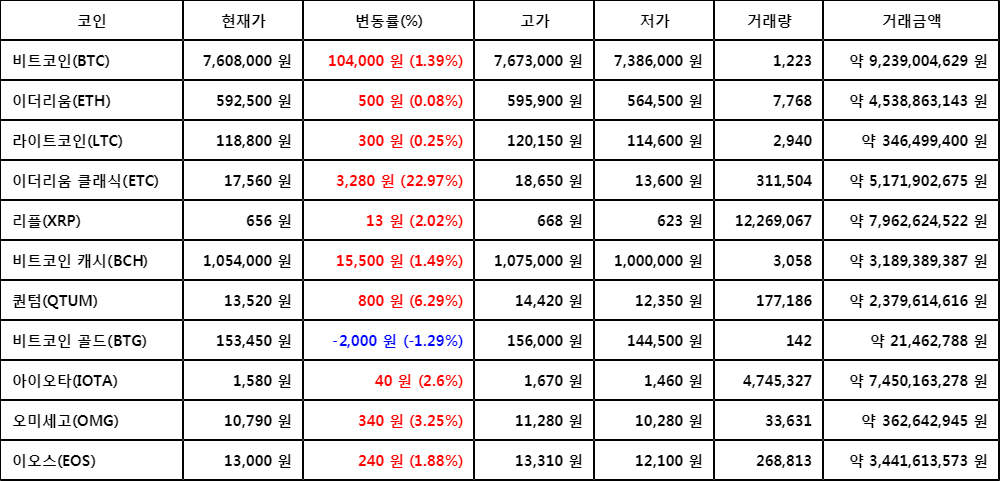 현재 암호화폐 거래소 "코인원"에 따르면 가상화폐 대장 격인 비트코인의 시세는 24시간 전 대비 104,000원(1.39%) 상승한 7,608,000원에 거래되고 있다.