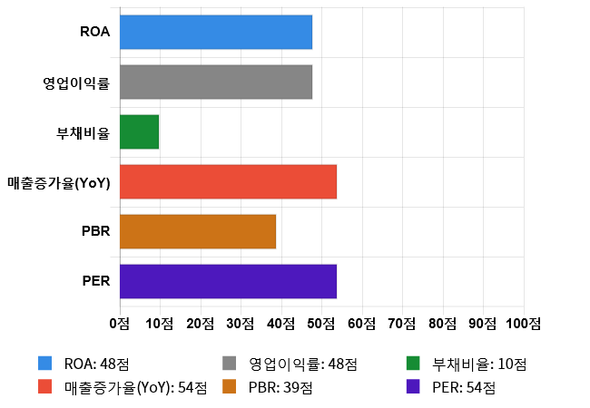 (위의 AI인공지능 점수는 재무 데이터를 기반으로 전체 상장 종목과 비교/분석하여 도출한 점수로 높은 점수가 반드시 높은 수익률을 보장하지 않습니다. 위의 자료는 당사의 추천 종목이 아니며, 투자 시 참고용으로 제시해드리는 것입니다.)