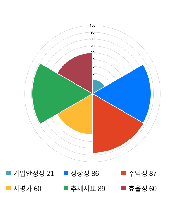 AI 인공지능 종목 분석 시스템을 이용해 성장성, 수익성, 효율성, 안전성, 저평가성, 추세 등 주가 수익률에 영향을 줄 수 있는 6가지 핵심 투자 지표를 점수화하여 종목의 투자 매력도를 계산해보았다.
