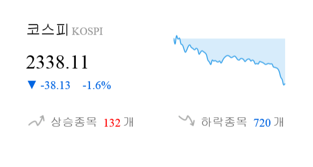 6월 19일 15시 15분 코스피는 전일 대비 38.13p(-1.6%) 큰 폭으로 하락한 2338.11p를 기록하고 있다.