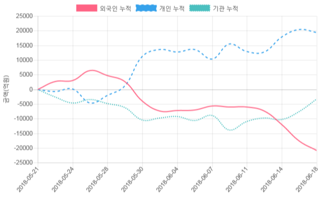 투자자별 매매동향을 살펴보면 개인이 홀로 1,892억원 순매수 하고 있다. 반면, 외인과 기관은 각각 -1,897억원, -357억원 순매도 중이다.