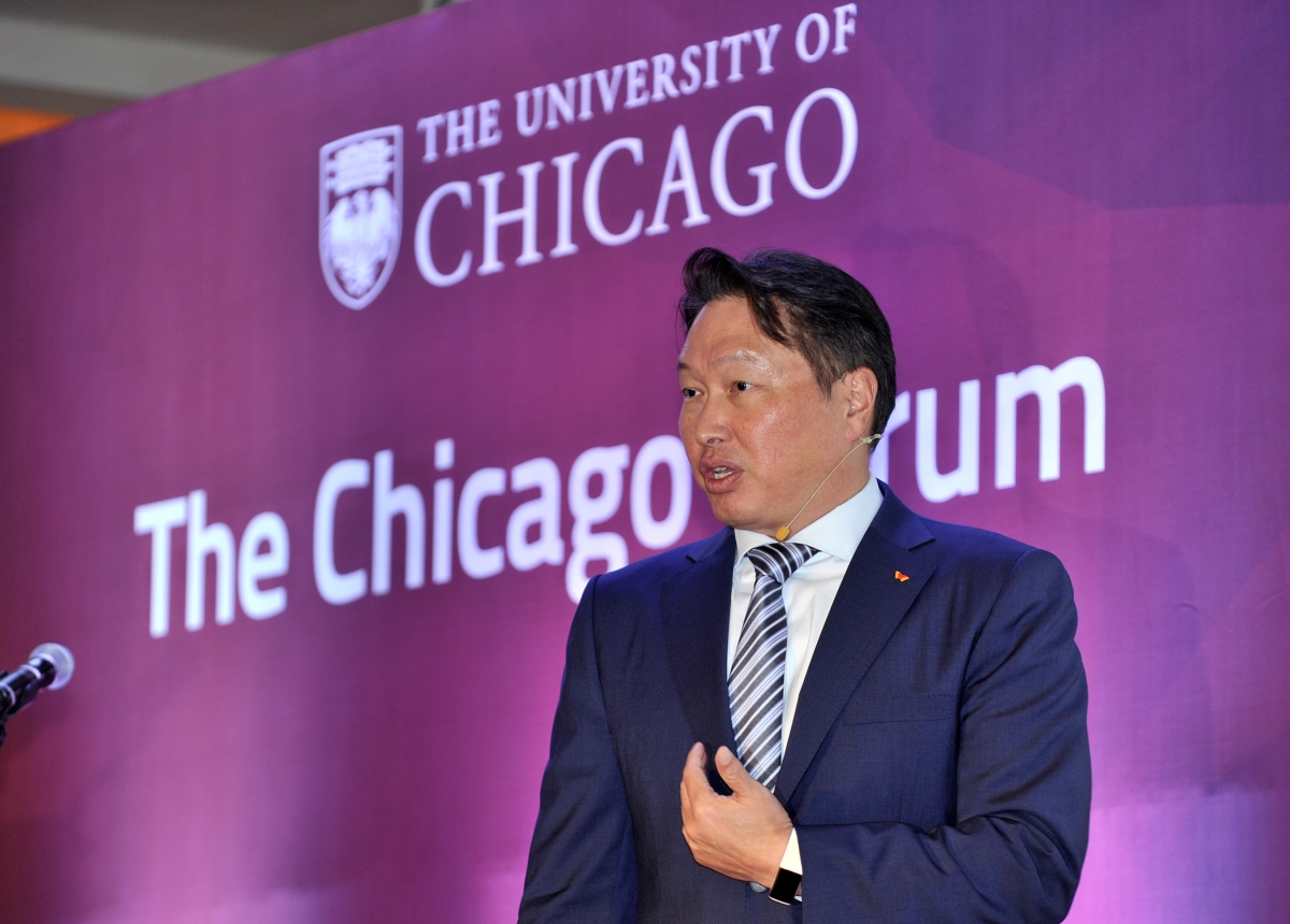 최태원 SK그룹 회장이 서울 삼성동 인터콘티넨탈호텔에서 열린 `시카고 포럼`에서 기업의 사회적 가치의 중요성에 대해 설명했습니다.