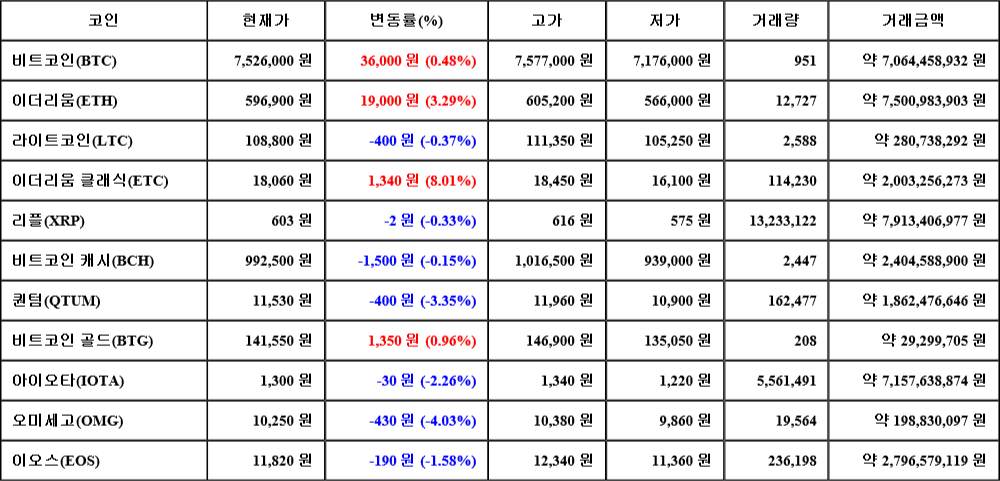 현재 암호화폐 거래소 "코인원"에 따르면 가상화폐 대장 격인 비트코인의 시세는 24시간 전 대비 36,000원(0.48%) 상승한 7,526,000원에 거래되고 있다.
