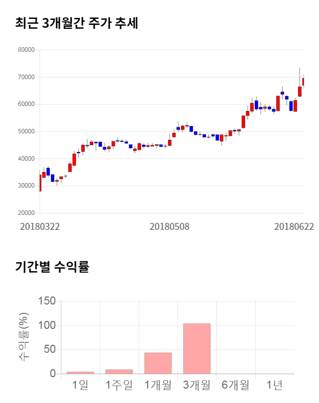 주가 모멘텀은 굉장히 좋은 편이었다. 최근 3개월 수익률이 무려 104.41%의 상승폭을 기록했다. 최근 1개월 수익률 또한 44.19% 상승하며 굉장히 좋은 모멘텀을 보이고 있다.