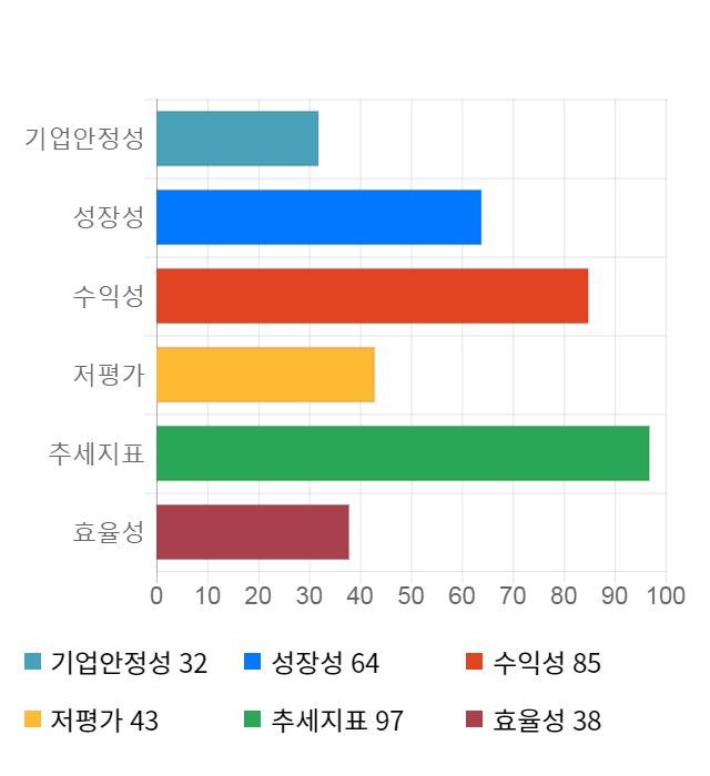 AI 인공지능 종목 분석 시스템을 이용해 성장성, 수익성, 효율성, 안전성, 저평가성, 추세 등 주가 수익률에 영향을 줄 수 있는 6가지 핵심 투자 지표를 점수화하여 종목의 투자 매력도를 계산해보았다.
