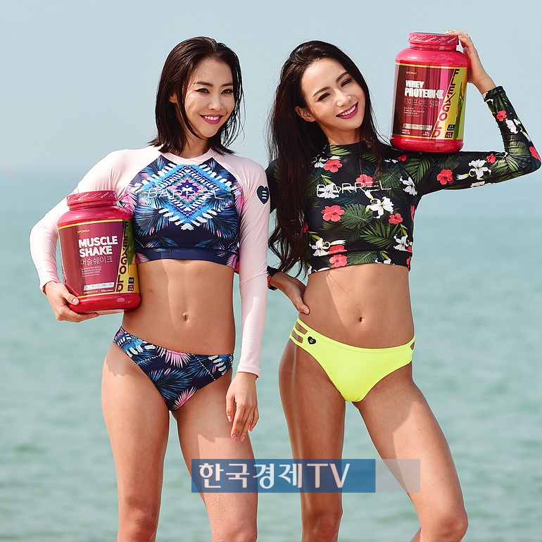 머슬마니아 홍다현과 전혜빈이 강원도 양양 서피비치에서 진행된 헬스 남성잡지 `맥스큐(MAXQ)` 7월호 표지 촬영현장에서 포즈를 취하고 있다.