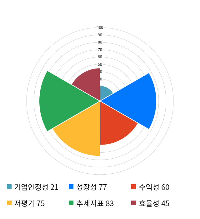 AI 인공지능 종목 분석 시스템을 이용해 성장성, 수익성, 효율성, 안전성, 저평가성, 추세 등 주가 수익률에 영향을 줄 수 있는 6가지 핵심 투자 지표를 점수화하여 종목의 투자 매력도를 계산해보았다.