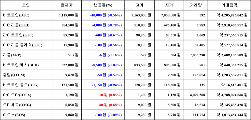 현재 암호화폐 거래소 "코인원"에 따르면 가상화폐 대장 격인 비트코인의 시세는 24시간 전 대비 40,000원(-0.56%) 하락한 7,119,000원에 거래되고 있다.