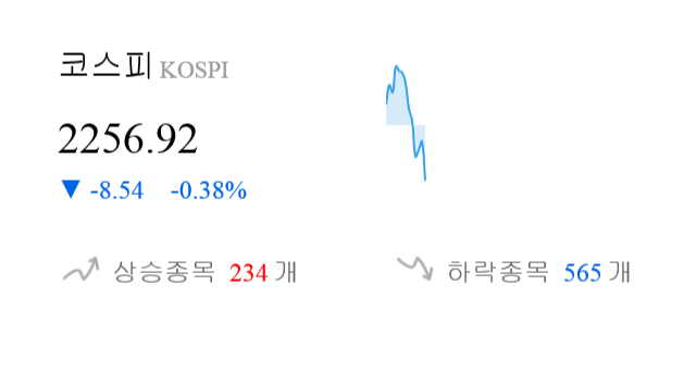 7월 5일 10시 0분 코스피는 전일 대비 8.54p(-0.38%) 하락한 2256.92p를 기록하고 있다.