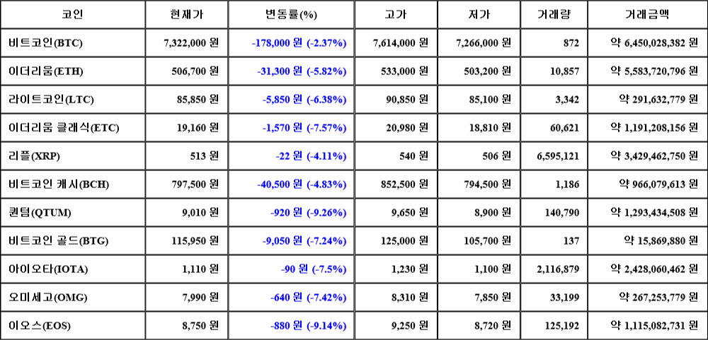 또한, 이오스(-9.14%, 8,750원), 이더리움 클래식(-7.57%, 19,160원), 아이오타(-7.5%, 1,110원), 오미세고(-7.42%, 7,990원), 비트코인 골드(-7.24%, 115,950원), 라이트코인(-6.38%, 85,850원), 이더리움(-5.82%, 506,700원), 비트코인 캐시(-4.83%, 797,500원), 리플(-4.11%, 513원)은 하락세를 보이고 있다.