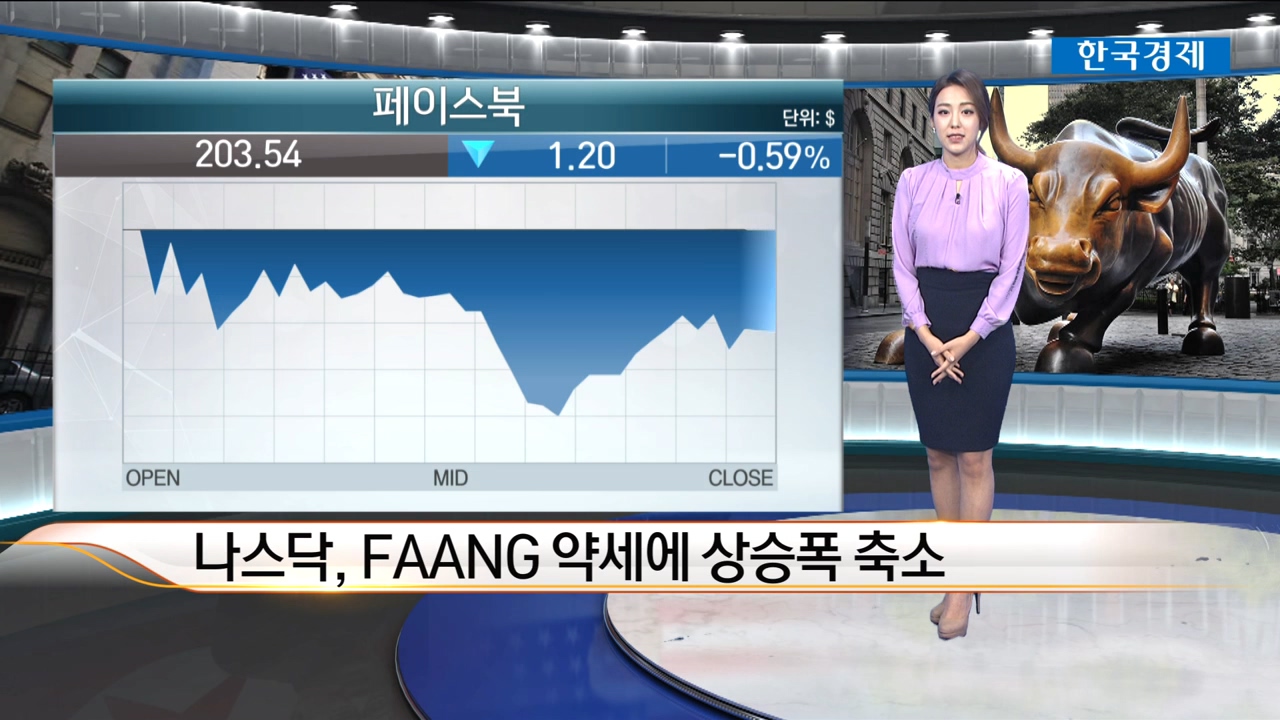 다음으로 나스닥 지수도 확인 해보시죠. 오늘 나스닥 지수는 그간 미증시 상승을 이끌었던 기술주가 약세를보이면서 장중 하락 하기도 했는데요, 오늘 0.04% 강보합권에서 마감 했습니다. 오늘 FAANG주들은 아마존을 제외하고 모두 하락 했는데요, 먼저, 넷플릭스는 월가의 투자의견 하향조정에 0.8% 빠졌구요, 페이스북도 오늘장에서 0.5% 약세를 보이면서 기술주 약세를 주도했습니다. 한편, 반도체 주들은 상승 흐름을 유지했는데요, 마이크론은 2.6% 오르면서 55달러선까지 올랐구요 엔비디아도 1.6% 강세를 유지했습니다. 이어서, 테슬라는 중국에 대규모 공장을 설립해, 연간 50만대를 생산한다고 알려지면서 올랐는데요, 1.24% 올라간 322달러선에 머물렀습니다.