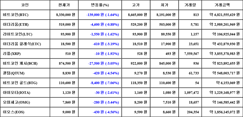 현재 암호화폐 거래소 "코인원"에 따르면 가상화폐 대장 격인 비트코인의 시세는 24시간 전 대비 139,000원(-1.64%) 하락한 8,330,000원에 거래되고 있다.