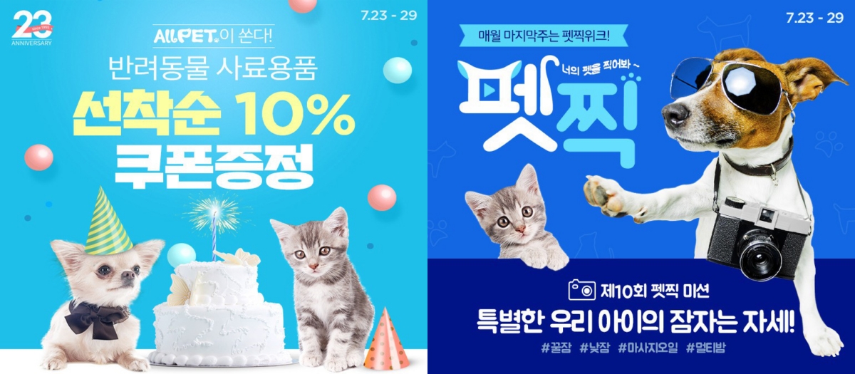 올펫 회원들의 커뮤니티 공간인 ‘올펫 스토리’에서는 고객 소통 이벤트를 진행합니다. `제10회 펫찍 콘테스트`(7월 23~29일)에서는 꿀잠 자는 반려동물들의 귀여운 모습을 찍어 올린 고객 중 ‘하트’를 제일 많이 받은 20명에게 반려동물 마사지 오일 등 총 30만원 상당의 경품을 제공합니다.