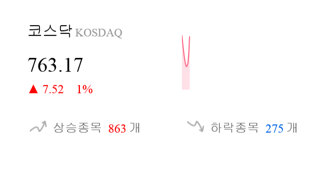 8월 14일 9시 26분 코스닥은 전일 대비 7.52p(1%) 큰 폭으로 상승한 763.17p를 기록하고 있다.
