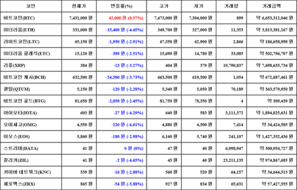 현재 암호화폐 거래소 "코인원"에 따르면 가상화폐 대장 격인 비트코인의 시세는 24시간 전 대비 42,000원(0.57%) 상승한 7,431,000원에 거래되고 있다.
