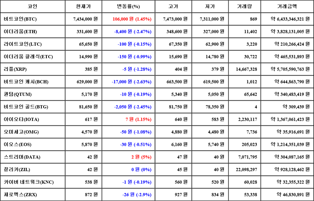 현재 암호화폐 거래소 "코인원"에 따르면 가상화폐 대장 격인 비트코인의 시세는 24시간 전 대비 106,000원(1.45%) 상승한 7,434,000원에 거래되고 있다.