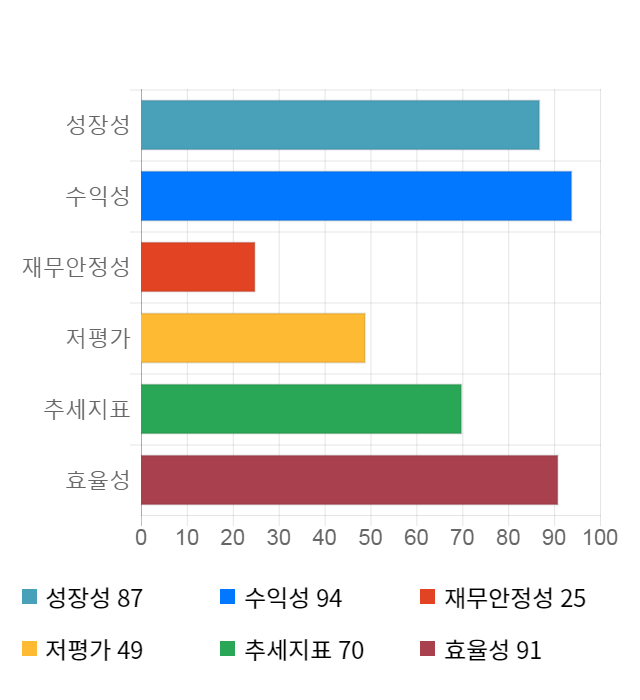 AI 인공지능 종목 분석 시스템을 이용해 성장성, 수익성, 효율성, 안전성, 저평가성, 추세 등 주가 수익률에 영향을 줄 수 있는 6가지 핵심 투자 지표를 점수화하여 종목의 투자 매력도를 계산해보았다.