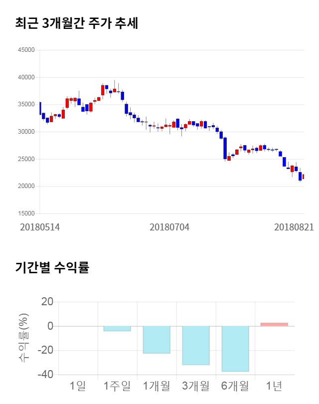 주가 모멘텀은 좋지 못했다. 최근 6개월 수익률은 -37.87%의 하락폭을 기록했다. 최근 1개월 수익률 또한 -22.96% 하락하며 부진한 모멘텀을 이어가고 있다.