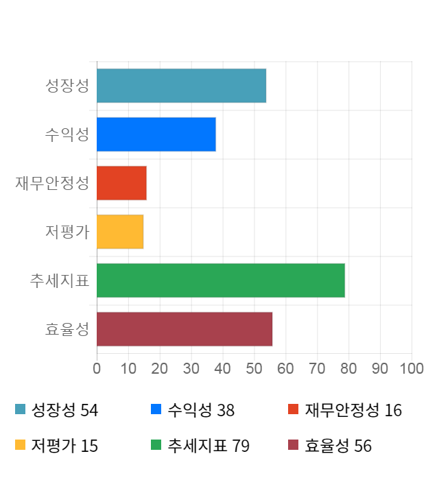 AI 인공지능 종목 분석 시스템을 이용해 성장성, 수익성, 효율성, 안전성, 저평가성, 추세 등 주가 수익률에 영향을 줄 수 있는 6가지 핵심 투자 지표를 점수화하여 종목의 투자 매력도를 계산해보았다.