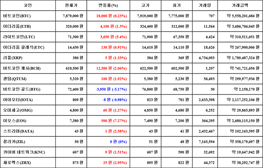 현재 암호화폐 거래소 "코인원"에 따르면 가상화폐 대장 격인 비트코인의 시세는 24시간 전 대비 18,000원(0.23%) 상승한 7,879,000원에 거래되고 있다.