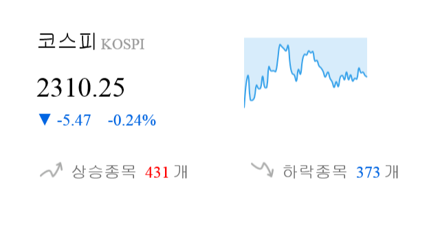 9월 5일 14시 0분 코스피는 전일 대비 5.47p(-0.24%) 하락한 2310.25p를 기록하고 있다.