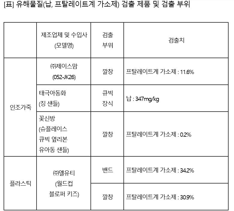 3개 제품에서는 피부와 직접 접촉하는 깔창과 발등 밴드에서 안전기준(0.1% 이하)을 최대 342배(최소 0.2%∼최대 34.2%) 초과하는 프탈레이트계 가소제가, 1개 제품 인조보석 장식품에서는 안전기준(300㎎/㎏ 이하)을 1.15배 초과(347㎎/㎏)하는 납이 검출됐다.