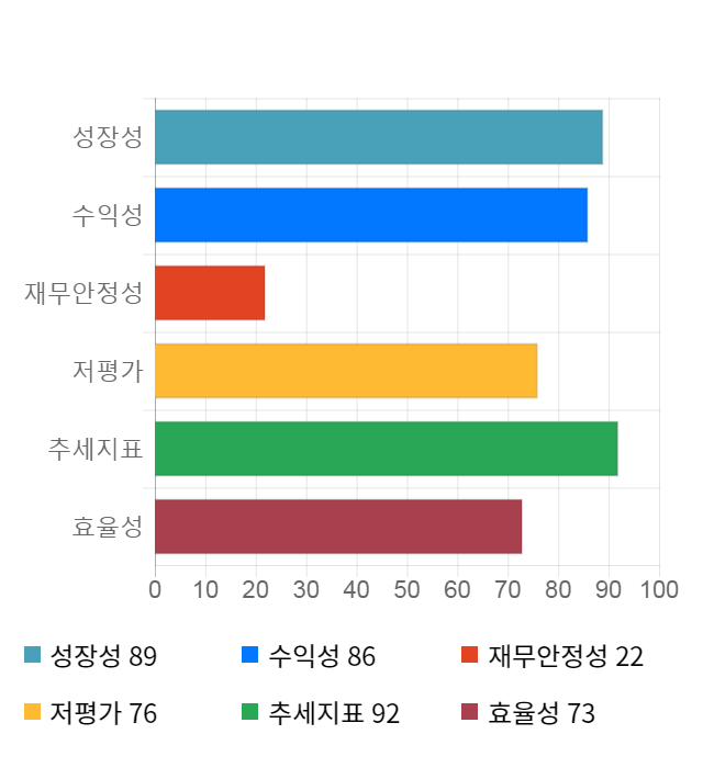 AI 인공지능 종목 분석 시스템을 이용해 성장성, 수익성, 효율성, 안전성, 저평가성, 추세 등 주가 수익률에 영향을 줄 수 있는 6가지 핵심 투자 지표를 점수화하여 종목의 투자 매력도를 계산해보았다.