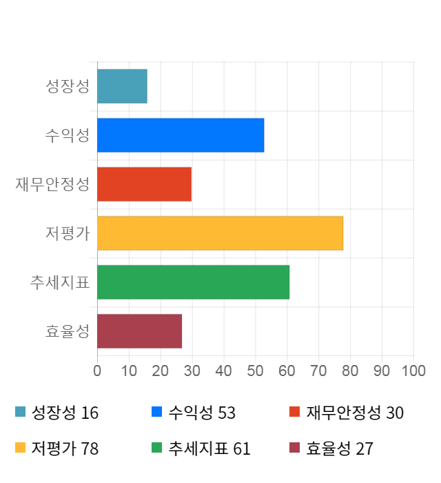 AI 인공지능 종목 분석 시스템을 이용해 성장성, 수익성, 효율성, 안전성, 저평가성, 추세 등 주가 수익률에 영향을 줄 수 있는 6가지 핵심 투자 지표를 점수화하여 종목의 투자 매력도를 계산해보았다.
