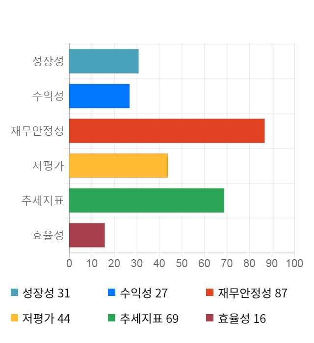 AI 인공지능 종목 분석 시스템을 이용해 성장성, 수익성, 효율성, 안전성, 저평가성, 추세 등 주가 수익률에 영향을 줄 수 있는 6가지 핵심 투자 지표를 점수화하여 종목의 투자 매력도를 계산해보았다.