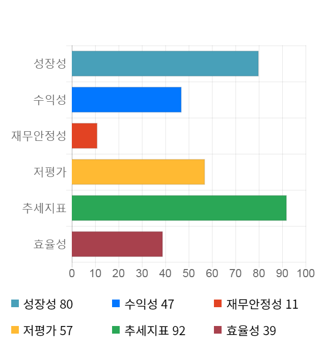 AI 인공지능 종목 분석 시스템을 이용해 성장성, 수익성, 효율성, 안전성, 저평가성, 추세 등 주가 수익률에 영향을 줄 수 있는 6가지 핵심 투자 지표를 점수화하여 종목의 투자 매력도를 계산해보았다.