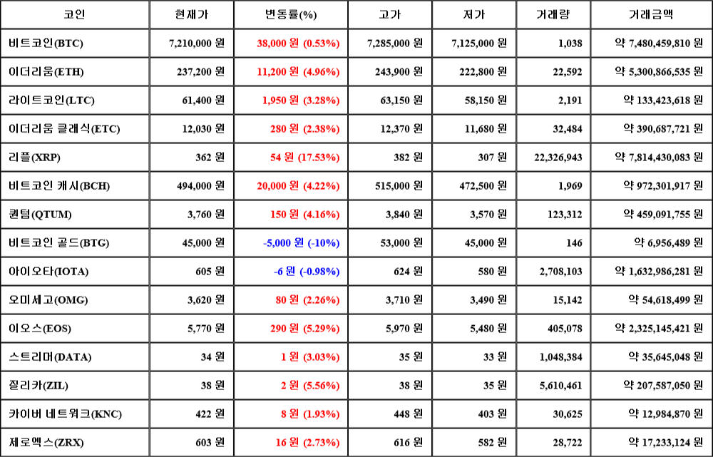 현재 암호화폐 거래소 "코인원"에 따르면 가상화폐 대장 격인 비트코인의 시세는 24시간 전 대비 38,000원(0.53%) 상승한 7,210,000원에 거래되고 있다.