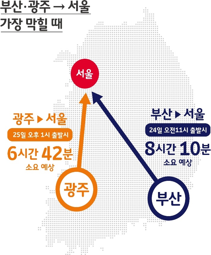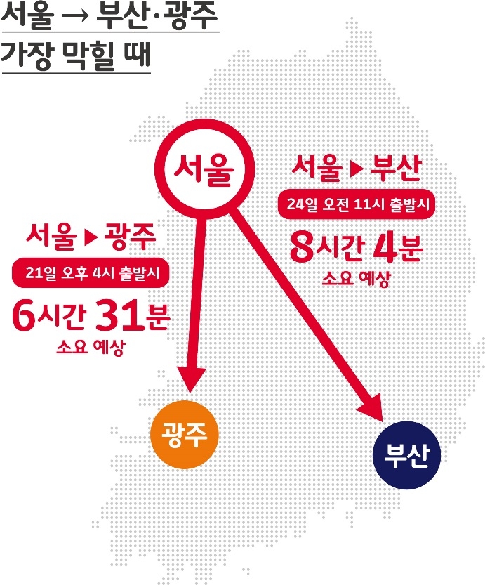 한편, 서울에서 광주 구간은 연휴 하루전인 21일 오후 4시에 출발할 경우 6시간 31분이, 23일 밤 11시에 출발하면 3시간 10분이 걸릴 것으로 예상했습니다.