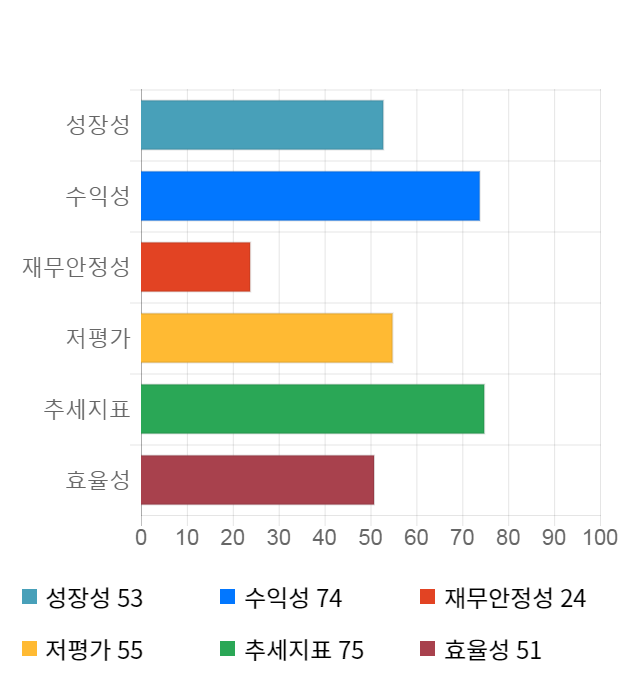 AI 인공지능 종목 분석 시스템을 이용해 성장성, 수익성, 효율성, 안전성, 저평가성, 추세 등 주가 수익률에 영향을 줄 수 있는 6가지 핵심 투자 지표를 점수화하여 종목의 투자 매력도를 계산해보았다.