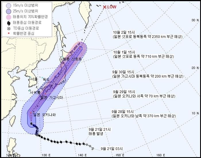 예보대로 태풍이 움직이면 일본 최남단 오키나와에서 열도를 종단하며 최북단 홋카이도에 걸쳐 사흘간 일본 전역을 할퀴고 지나가게 되는 것이다.
