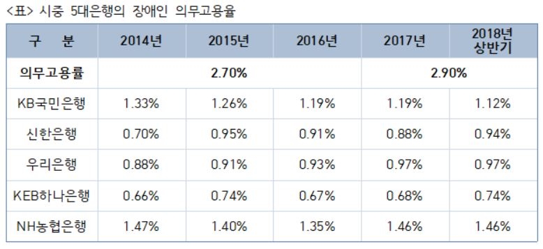 국회 정무위원회 소속 추혜선 의원(정의당)이 금융감독원으로부터 제출받은 `5대 시중은행의 년도별 장애인 의무고용 현황`을 확인한 결과, 2014년부터 2018년 상반기 5대 시중은행의 장애인 고용률은 평균 1.07%에 불과했습니다.
