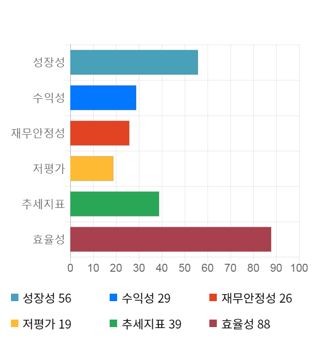 AI 인공지능 종목 분석 시스템을 이용해 성장성, 수익성, 효율성, 안전성, 저평가성, 추세 등 주가 수익률에 영향을 줄 수 있는 6가지 핵심 투자 지표를 점수화하여 종목의 투자 매력도를 계산해보았다.