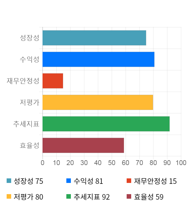 AI 인공지능 종목 분석 시스템을 이용해 성장성, 수익성, 효율성, 안전성, 저평가성, 추세 등 주가 수익률에 영향을 줄 수 있는 6가지 핵심 투자 지표를 점수화하여 종목의 투자 매력도를 계산해보았다.